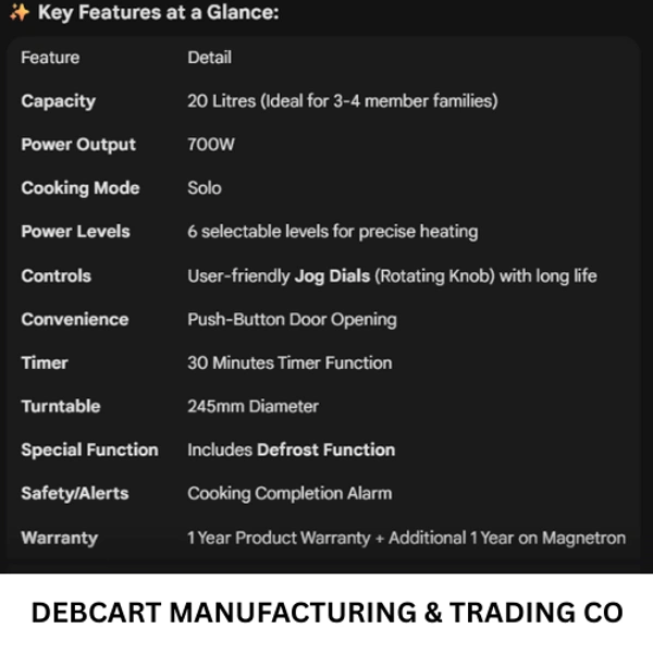 Transform your everyday cooking experience with the Voltas Beko MS20MPW10, a compact yet powerful 20-litre Solo Microwave Oven designed to deliver effortless and efficient performance. Whether you're reheating leftovers, preparing quick meals, or defrosting frozen ingredients, this microwave is the perfect addition to your kitchen. Its sleek, modern design and user-friendly features make it a must-have for anyone seeking convenience and style in one appliance.